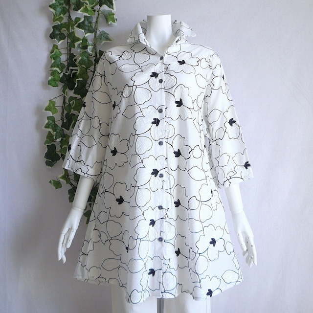 新品 9563 ML 大きな花刺繍 綿100% シャツ チュニック 春 夏 白系 レディース ロング シャツ 上品 50代 60代 70代