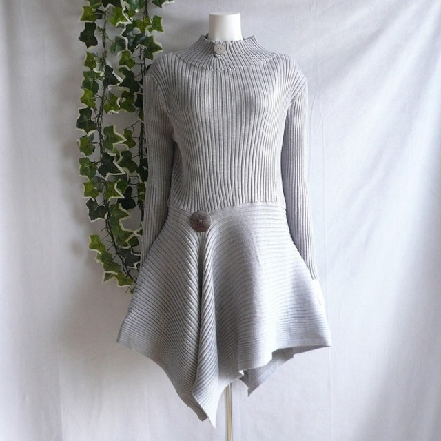 新品 8580 ML ニット ワンピース秋 冬 チュニック レディース グレー アシンメトリー飾りボタン ハイネック モード感 上質