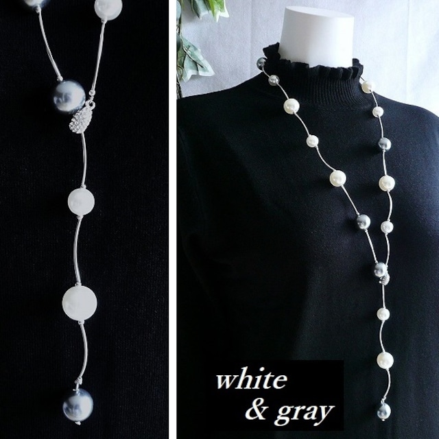新品 9034 ステーションパール Y字 ネックレス 白グレー系 2色使い 大粒ガラスパール ロング丈 レディース アクセサリー 上品