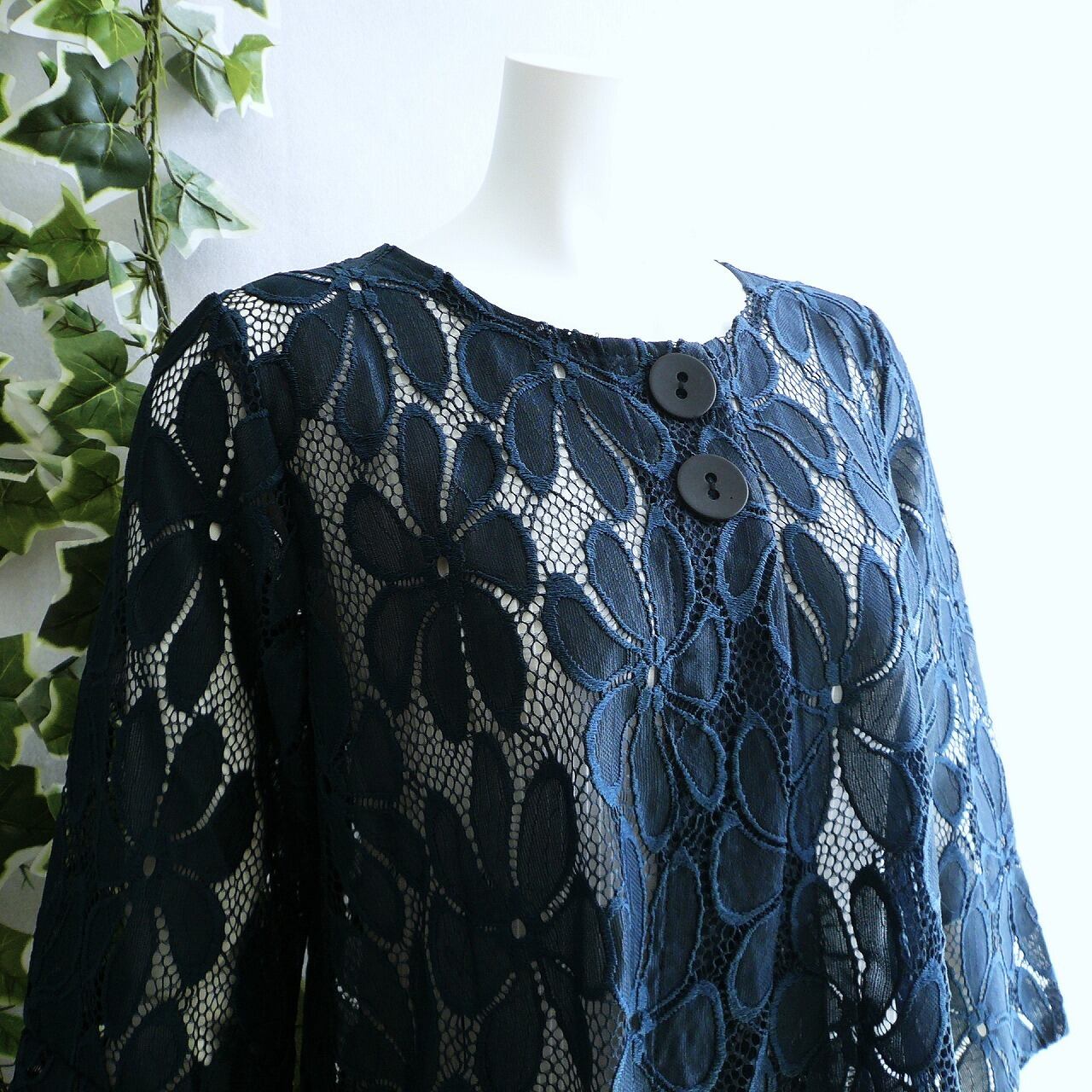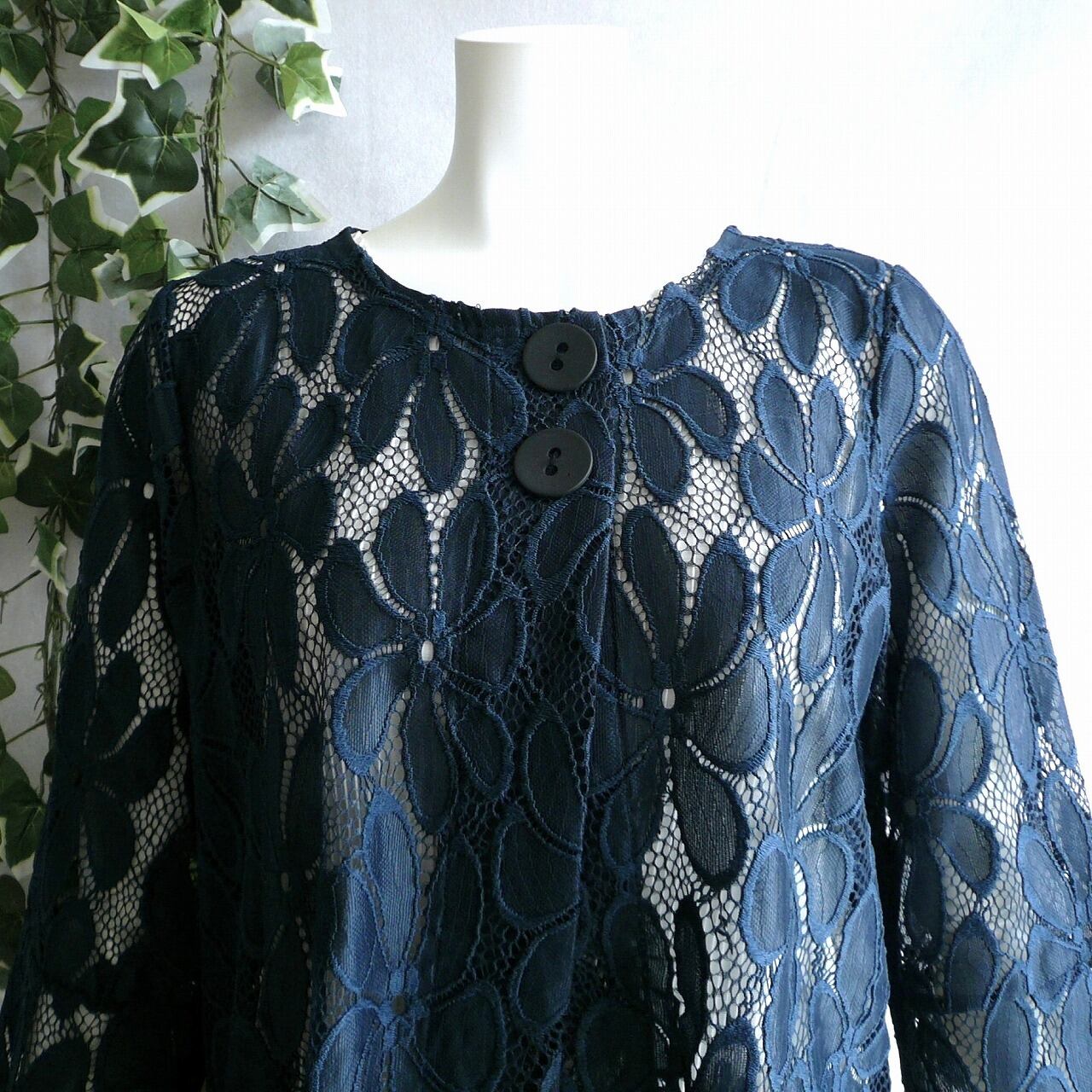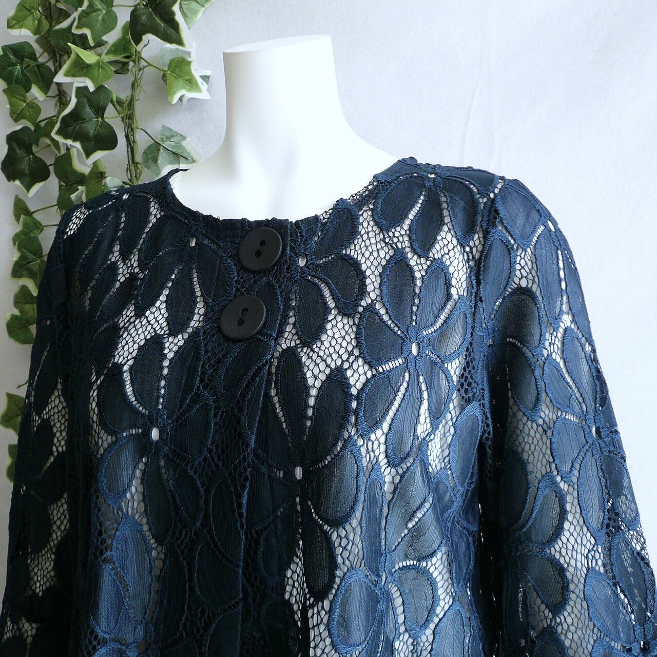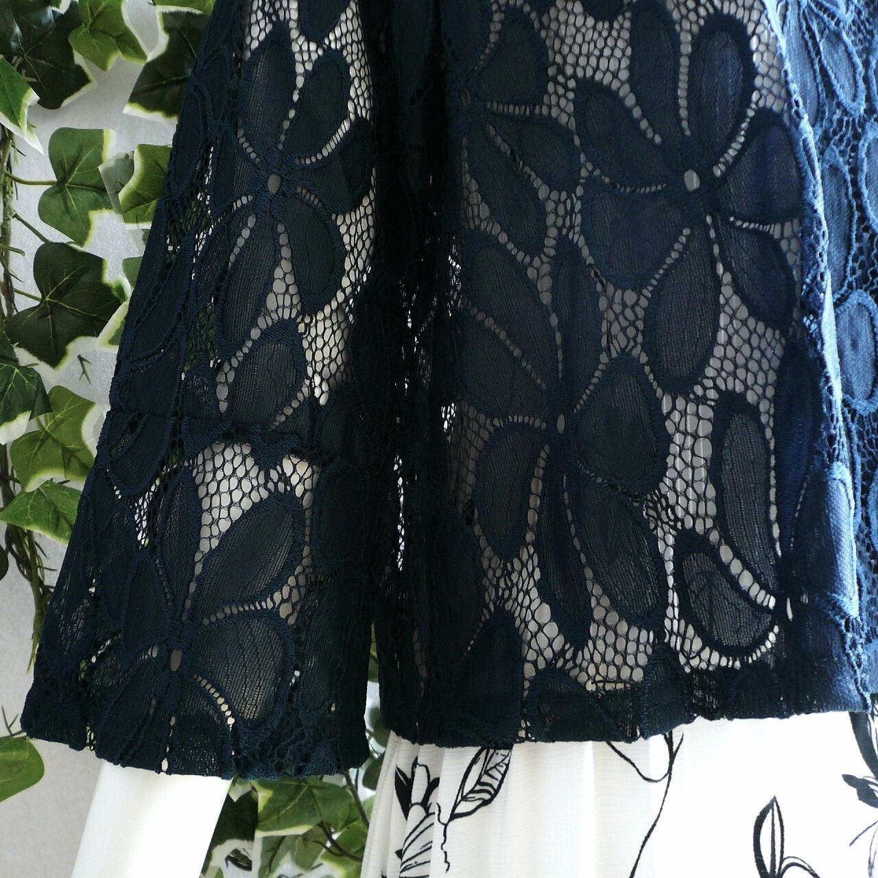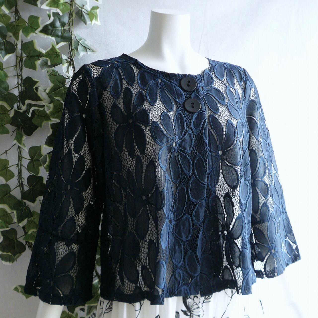 新品 9601 ML カットワーク 刺繍 クロシェ レース フレア ジャケット 春 夏 紺 レディース ノーカラー 七分袖 カーディガン 50代 60代 70代