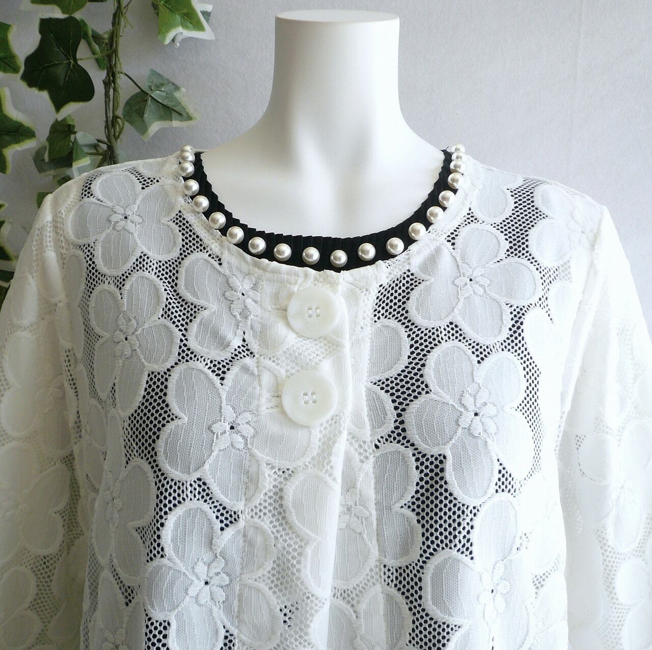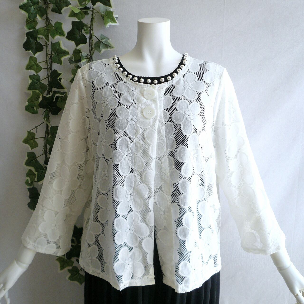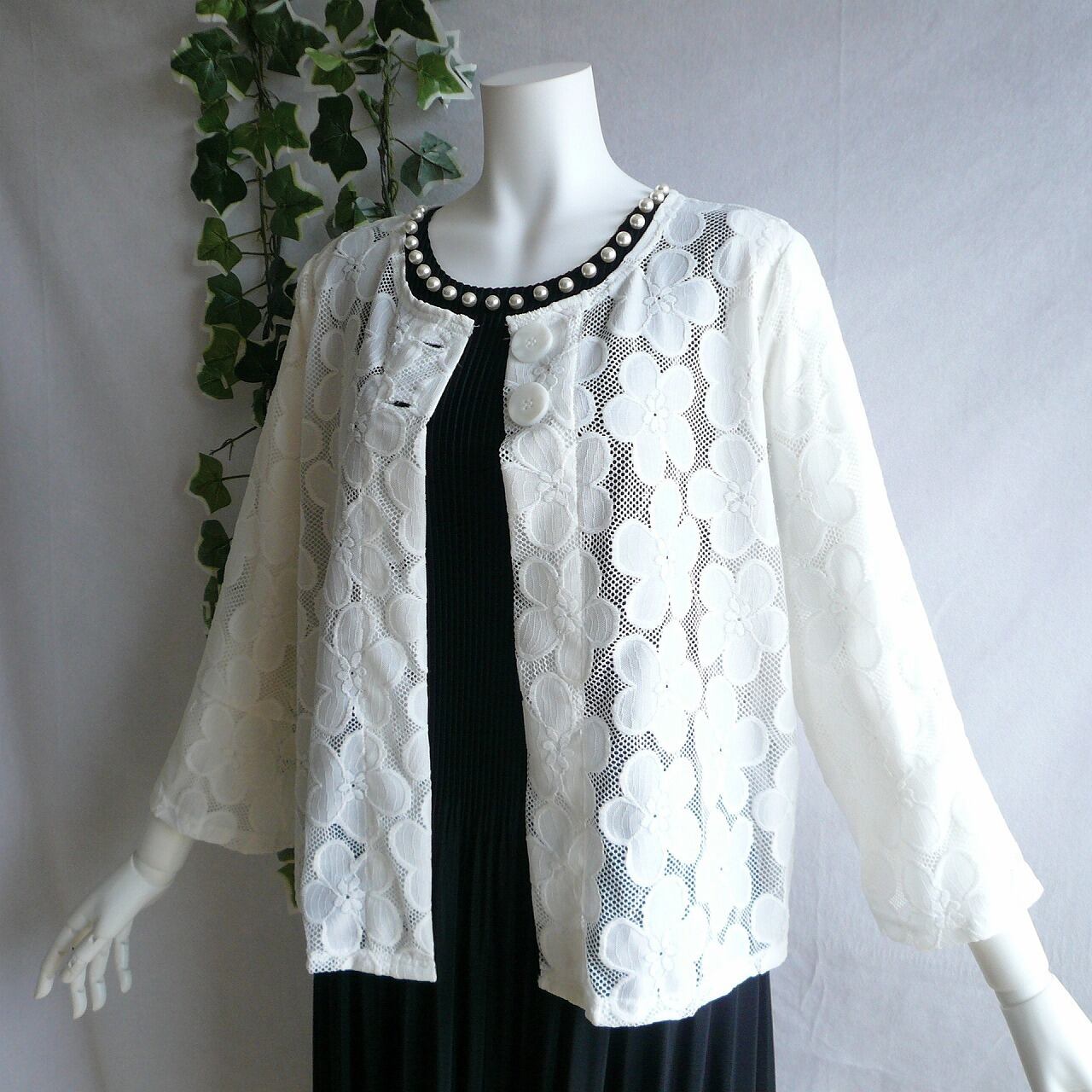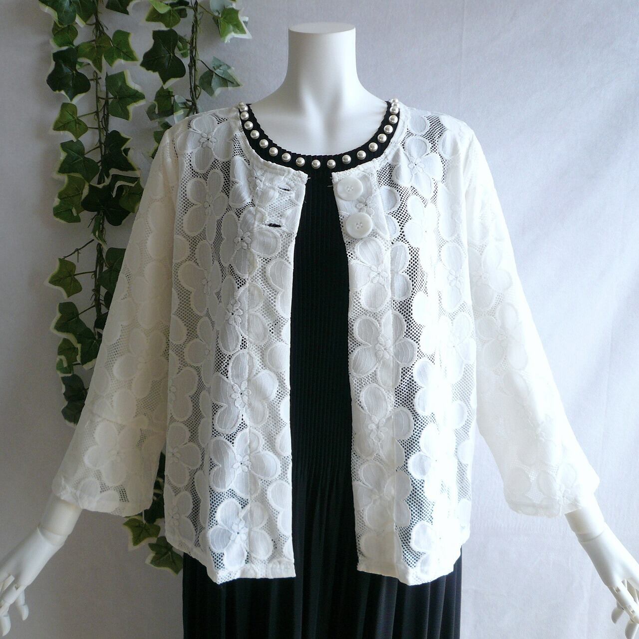 新品 9848 L クロシェ 刺繍 レース ジャケット オフ白 春 夏 レディース ノーカラー カットワーク 高級 上質 上品 50代 60代 70代