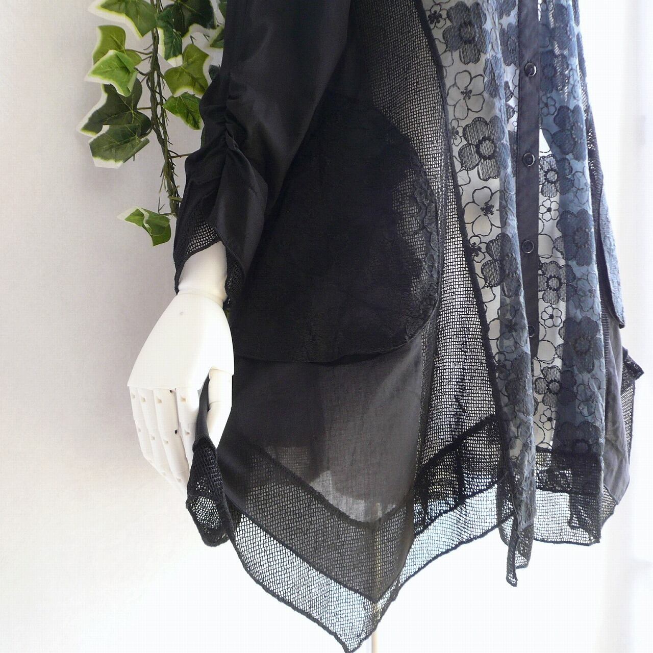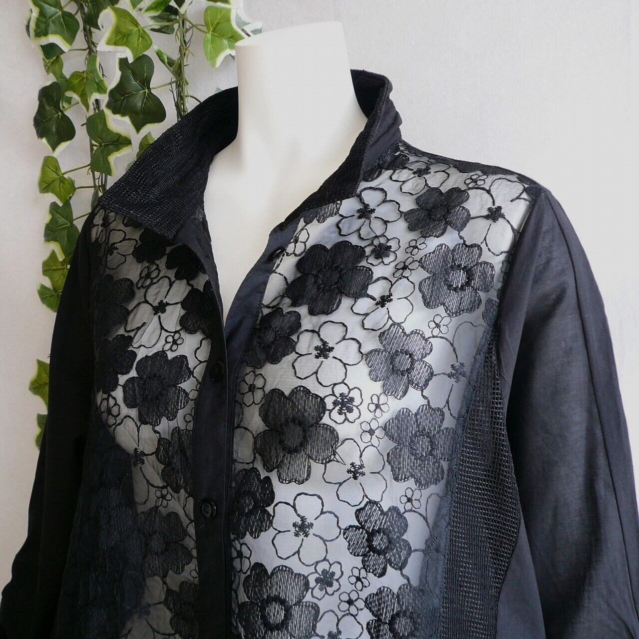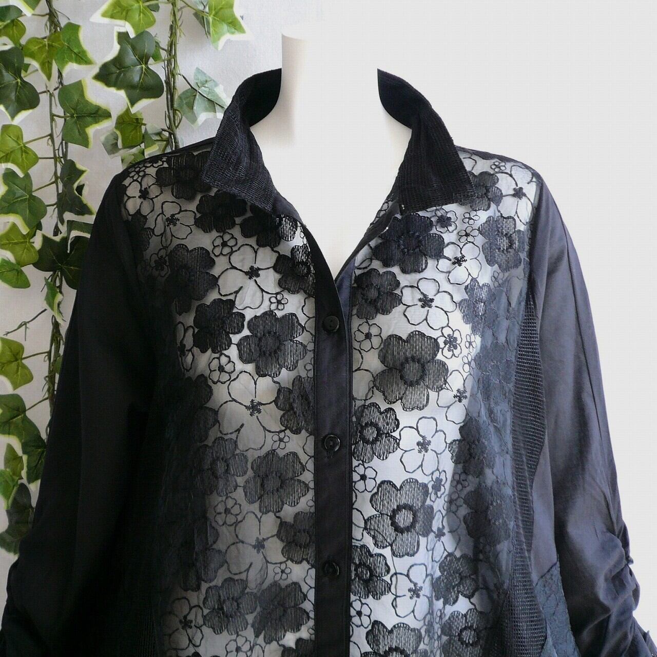新品 9836 ML オーガンジー 花刺繍 シャツ チュニック 黒 春 夏 秋 レディース 綿100% 美しい透け感 異素材切替 上品 50代 60代 70代
