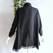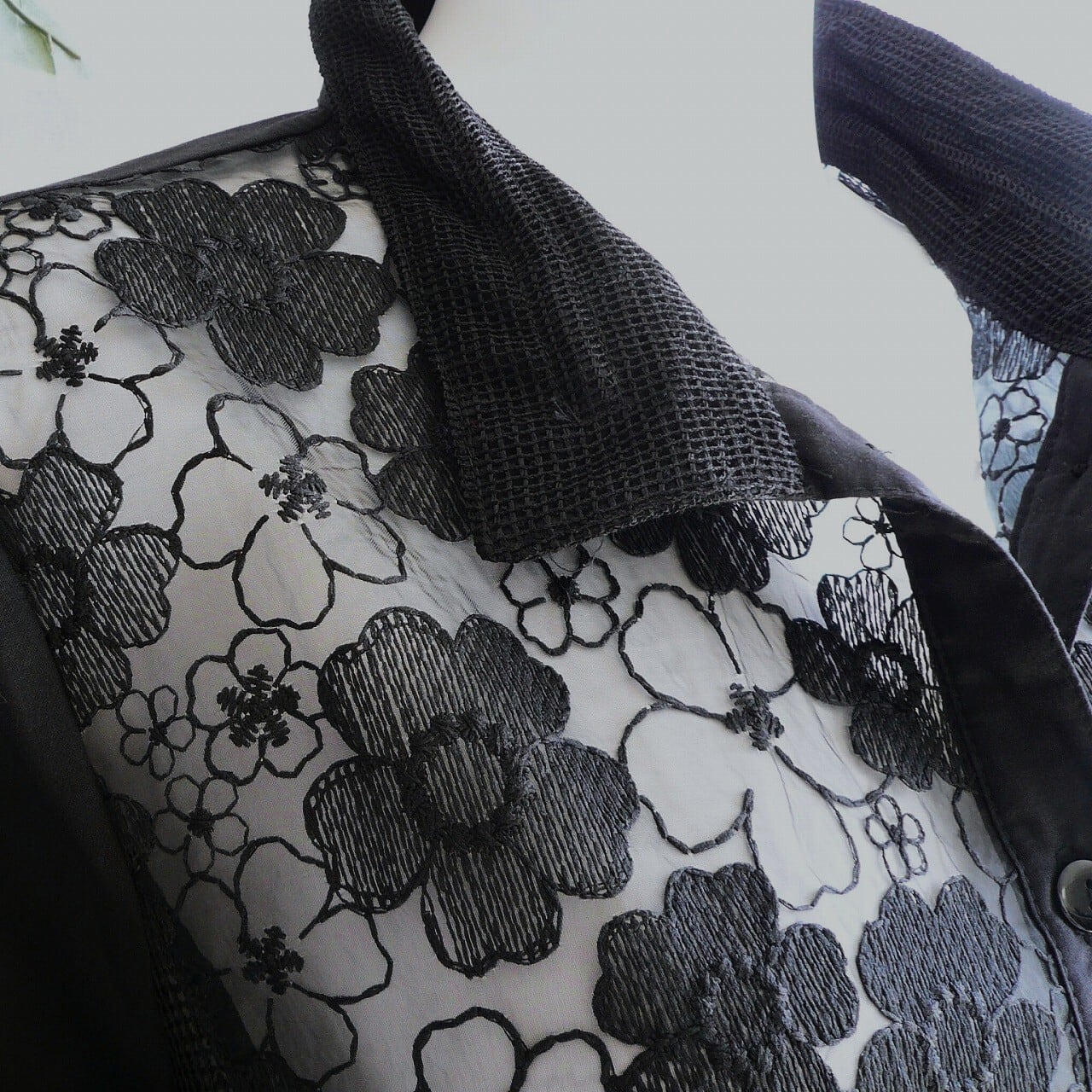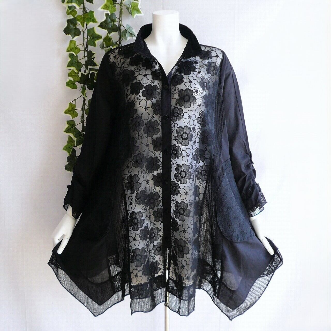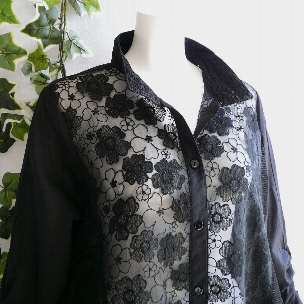 新品 9836 ML オーガンジー 花刺繍 シャツ チュニック 黒 春 夏 秋 レディース 綿100% 美しい透け感 異素材切替 上品 50代 60代 70代