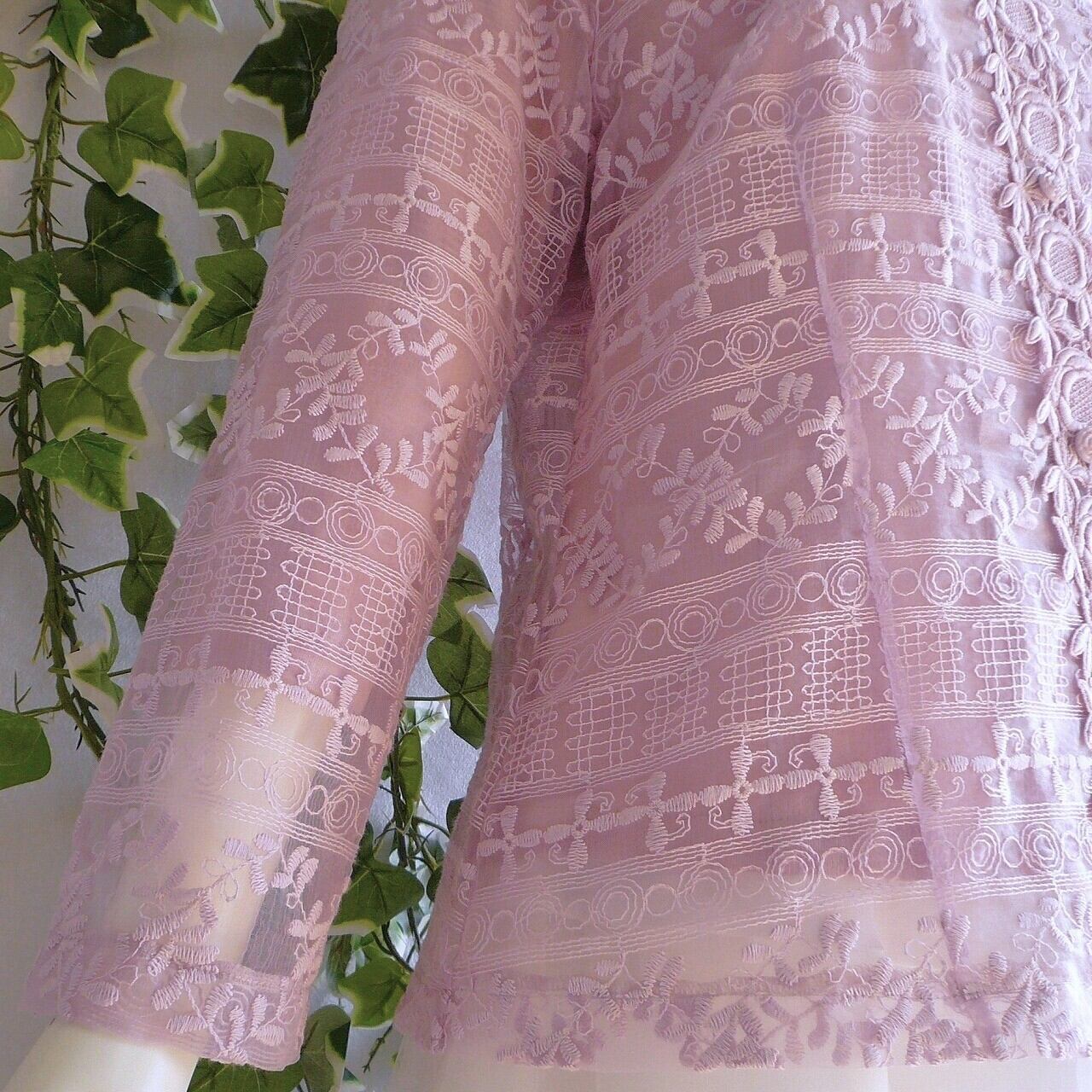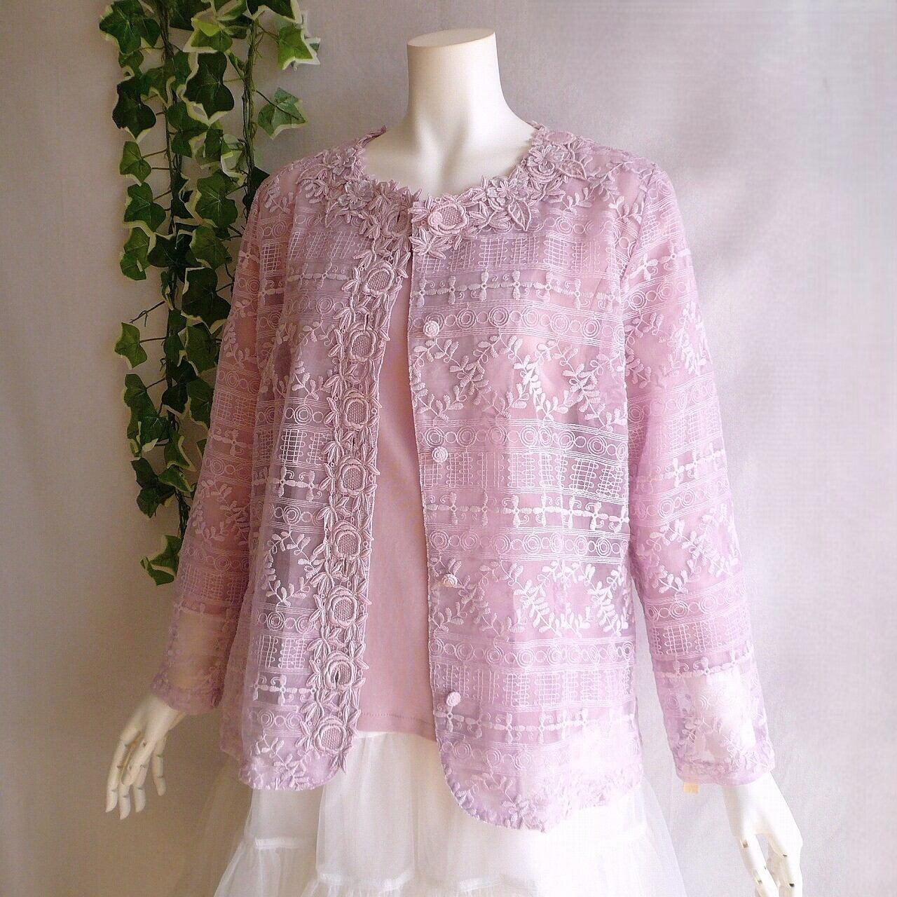 アウターは透け感が美しい総刺繍のオーガンジーと立体的な刺繍が魅力的なジャケット。