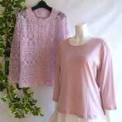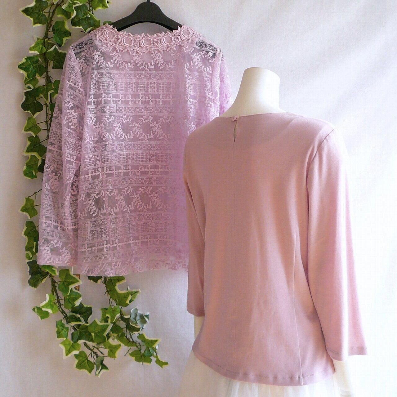 総刺繍のジャケットとシンプルカットソーとの上品なアンサンブルです。