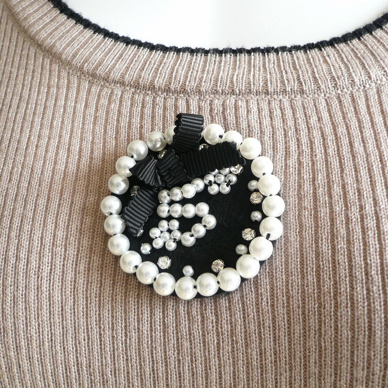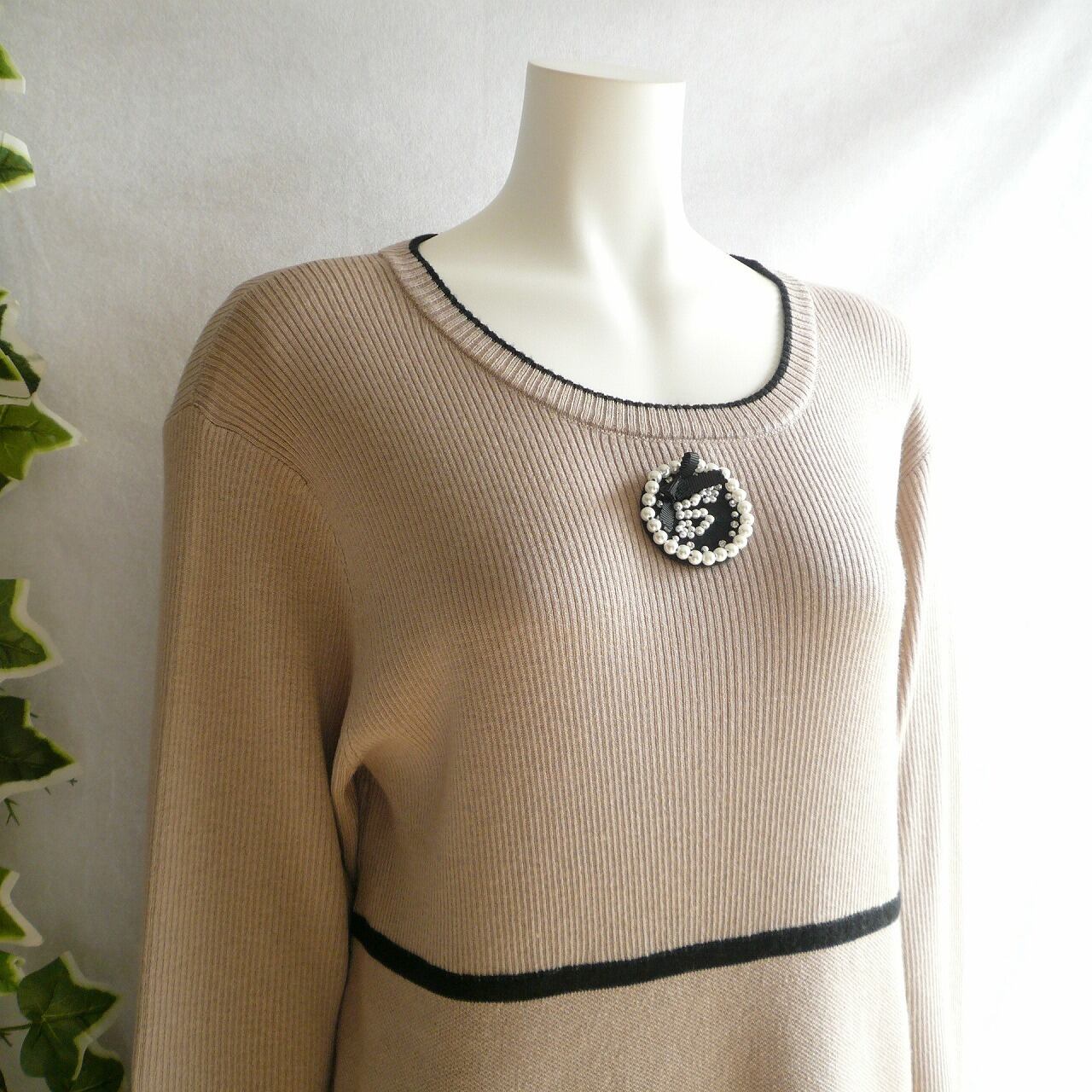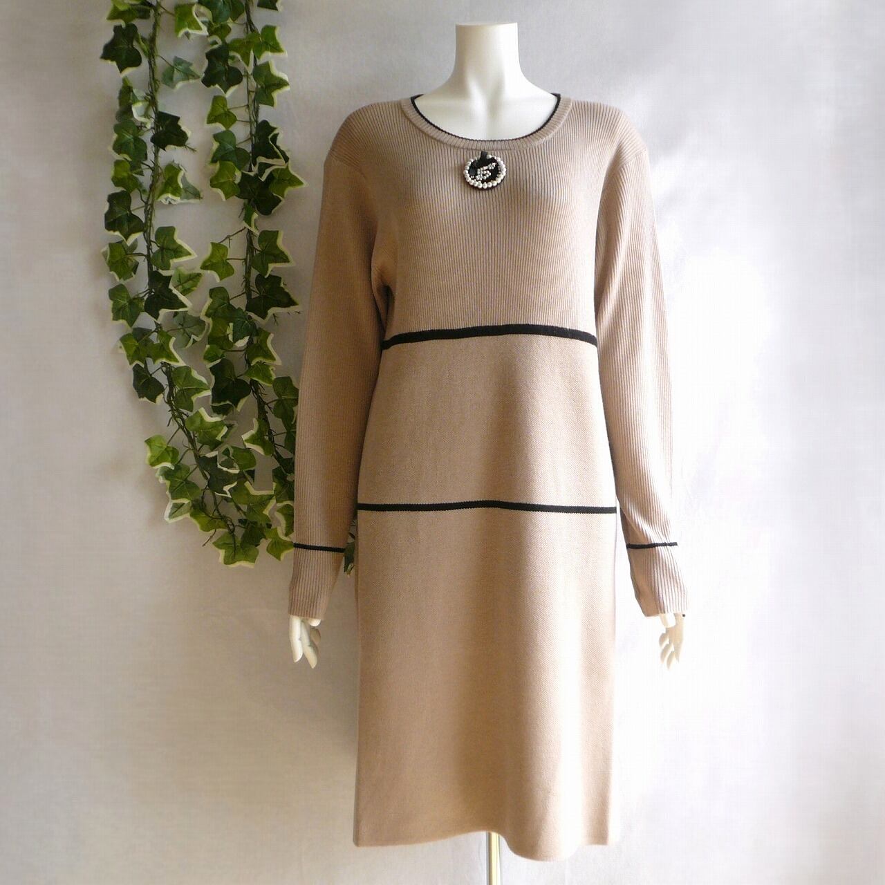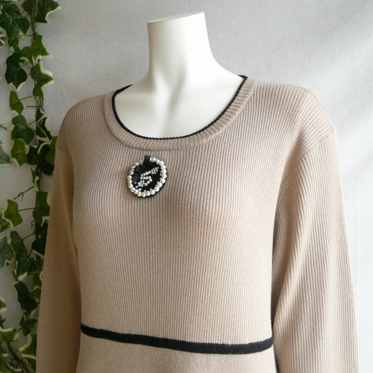 リボンとフェイクパールなどをあしらったブローチ風のモチーフ(取り外し不可)が、上品な華やかさを添える大人のニットワンピースです。