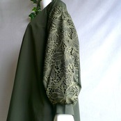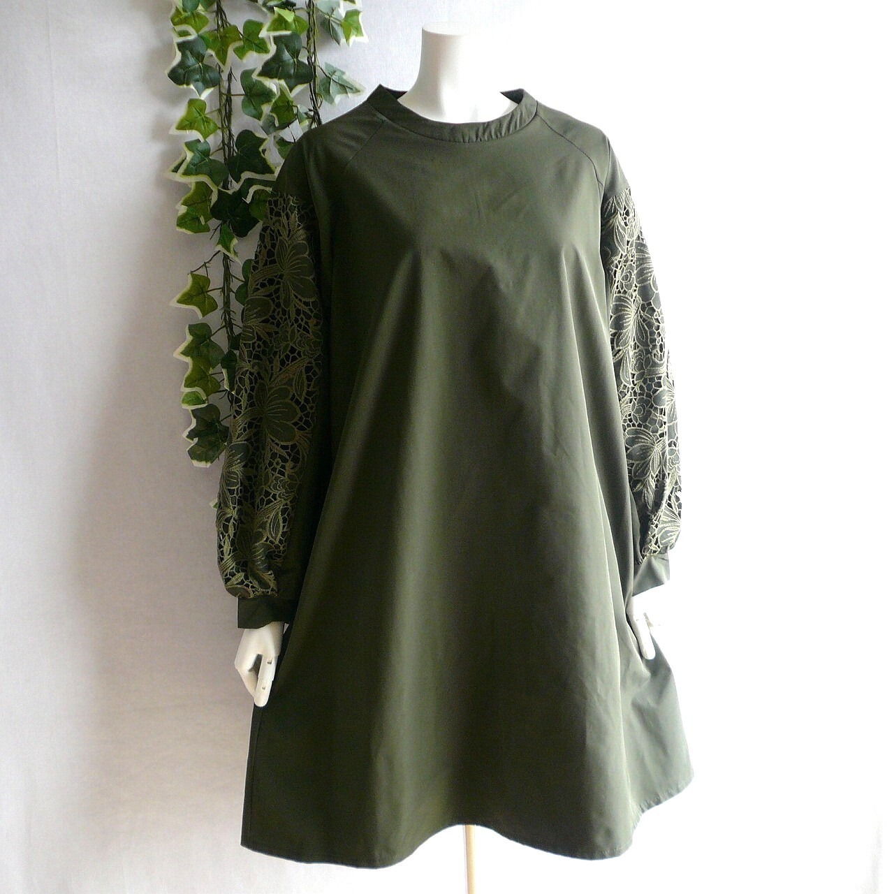 新品 9857 ML クロシェ刺繍レース袖 チュニック ワンピース カーキ 秋 冬 レディース Aライン 高級感 上質 上品 50代 60代 70代