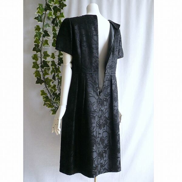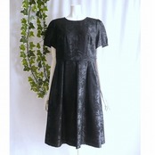 【ワンピース】大きな凹凸フロッキー風花模様フレアワンピース。透け感と光沢のあるシャンタン風素材。袖とウエストにタックあり。後ろにファスナー仕様。裏地あり。