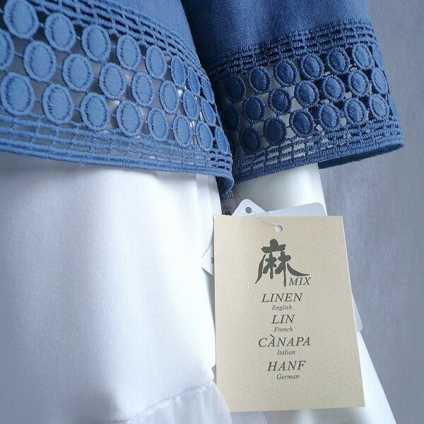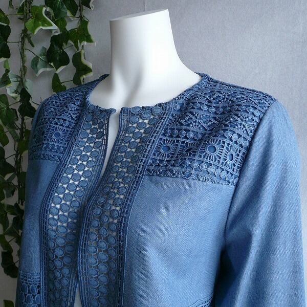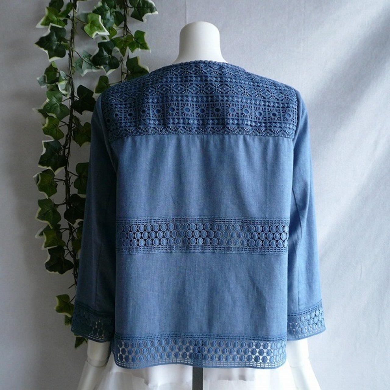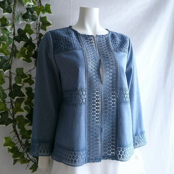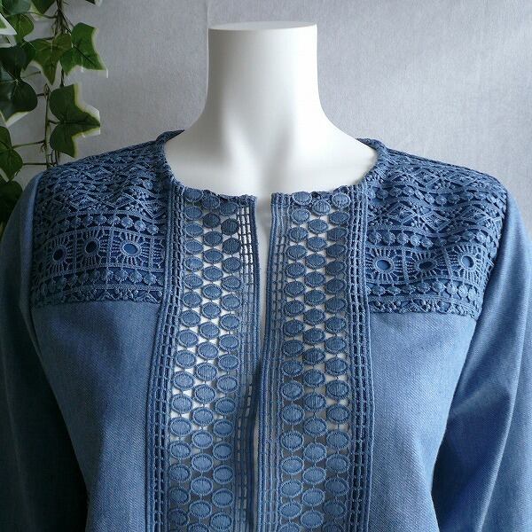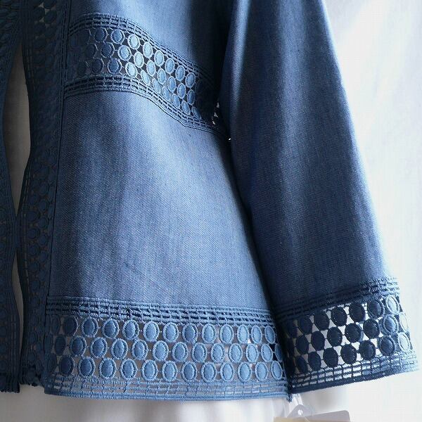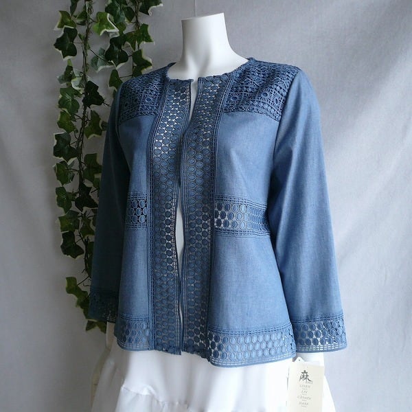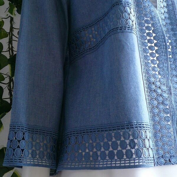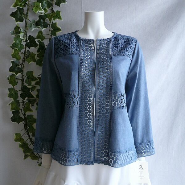 新品 8936 M ジャケット 秋 レディース 綿麻混 シャツ ブルー ヨーロッパ調 カットワーク 刺繍 レース 高級感 上品 上質 春 夏
