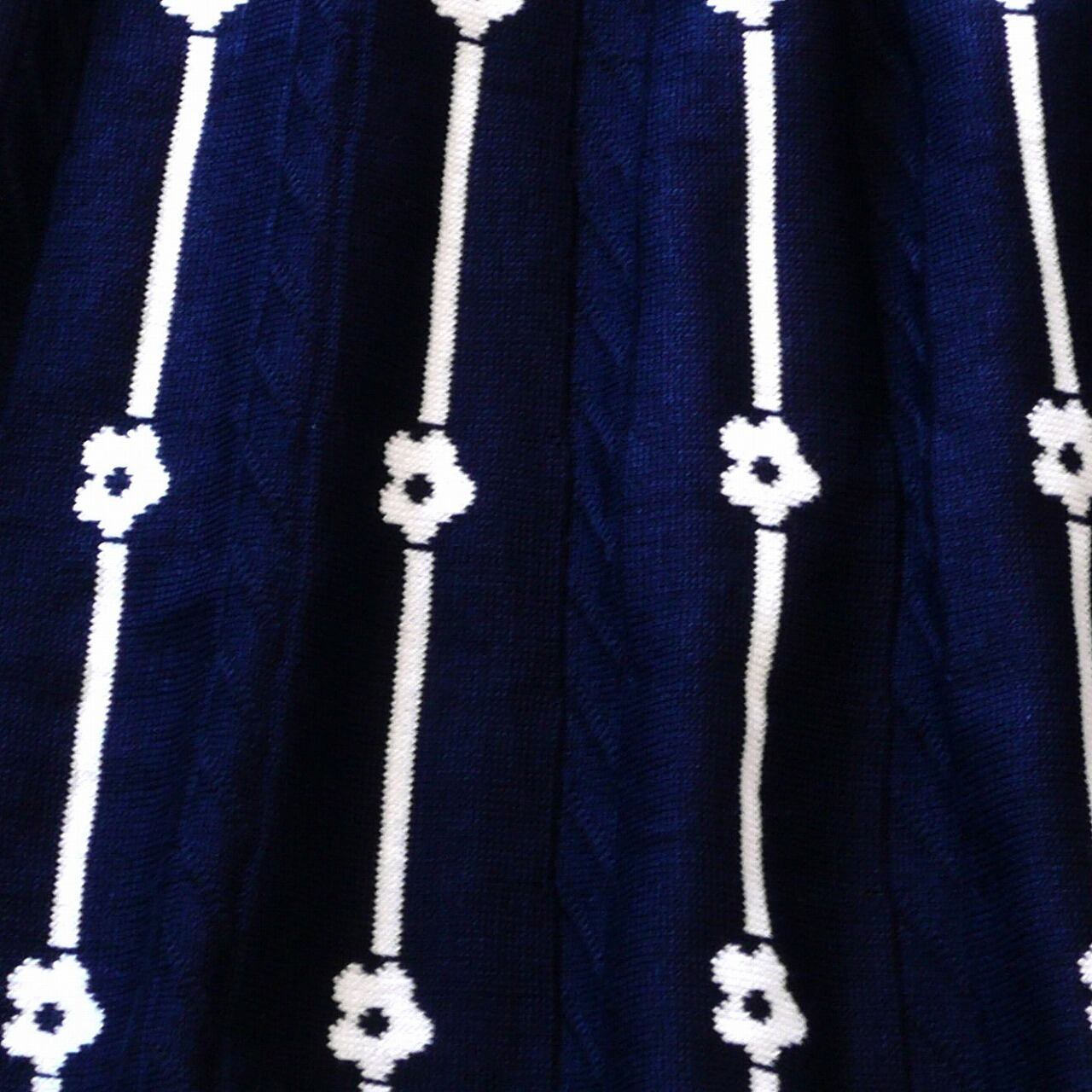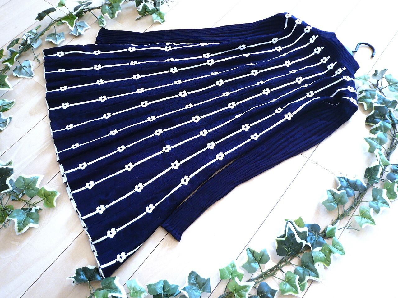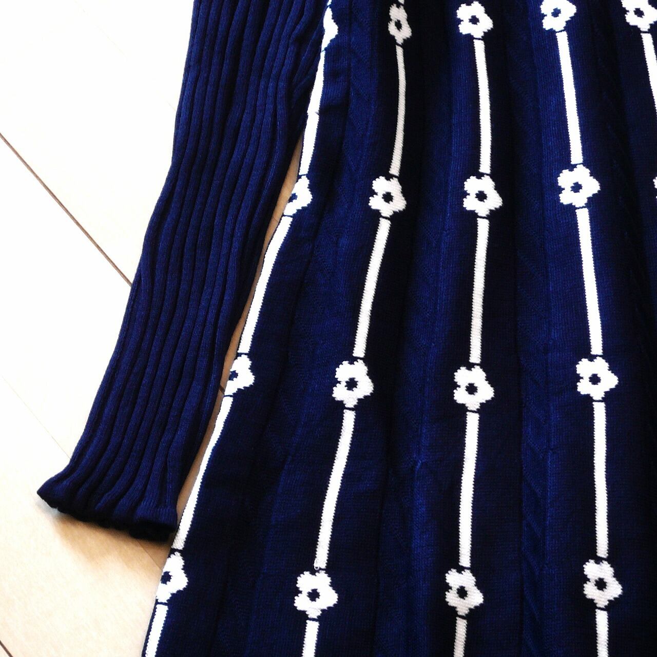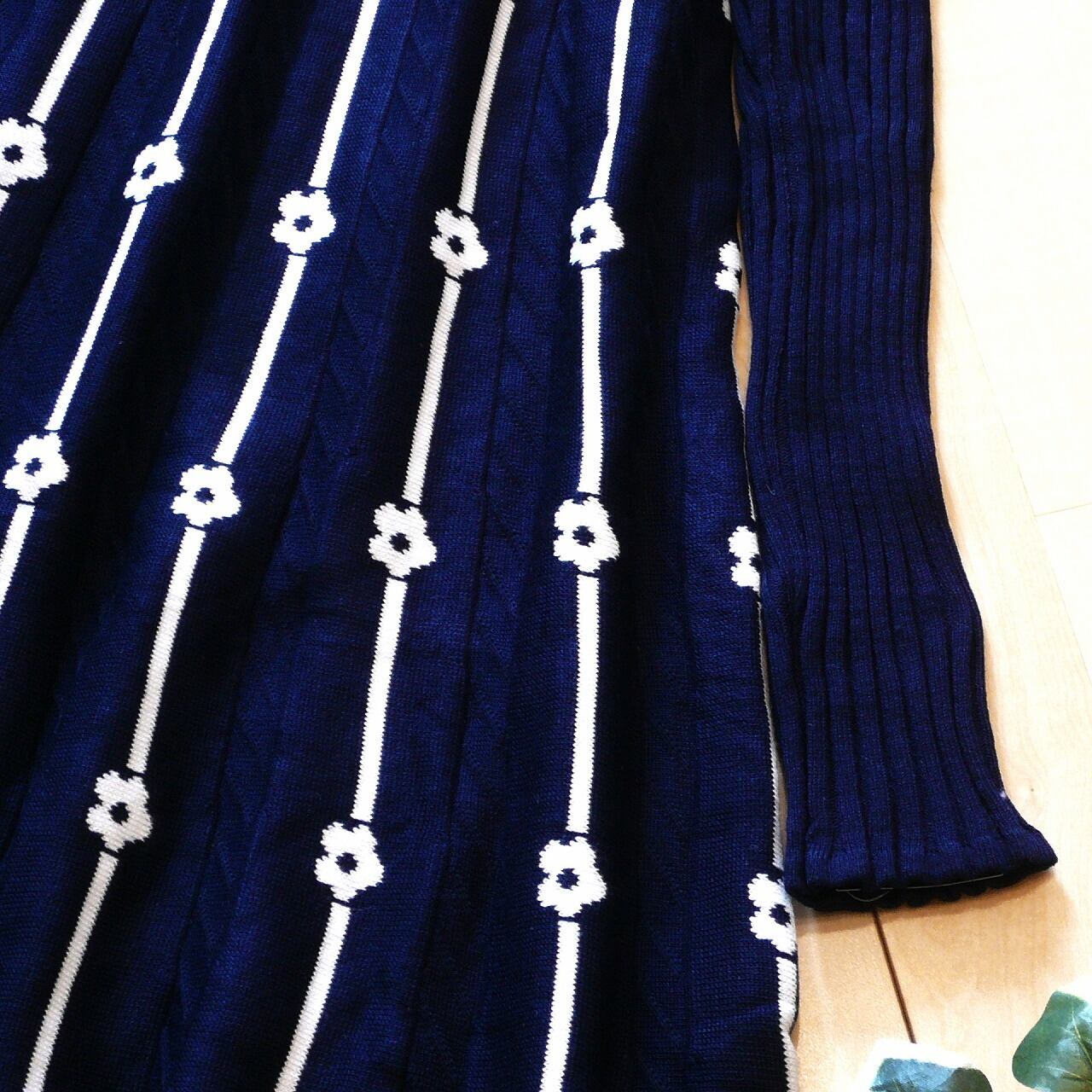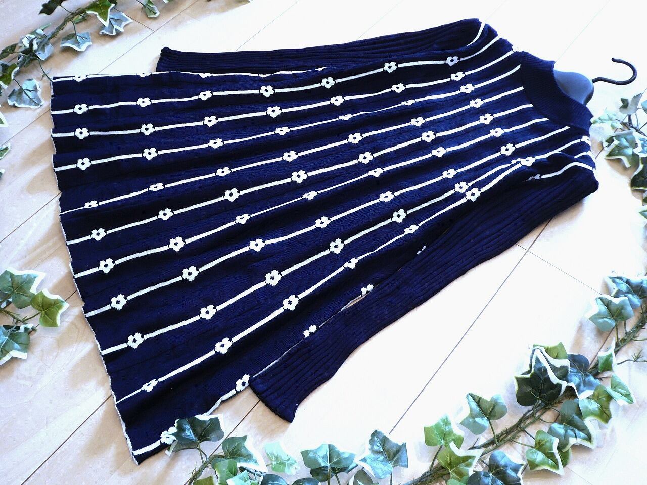 新品 9338 ML ニット チュニック ワンピース 秋 冬 プリーツ織 レディース 紺 白 ライン 花柄 ハイネック リブ切替袖 フレア 上品